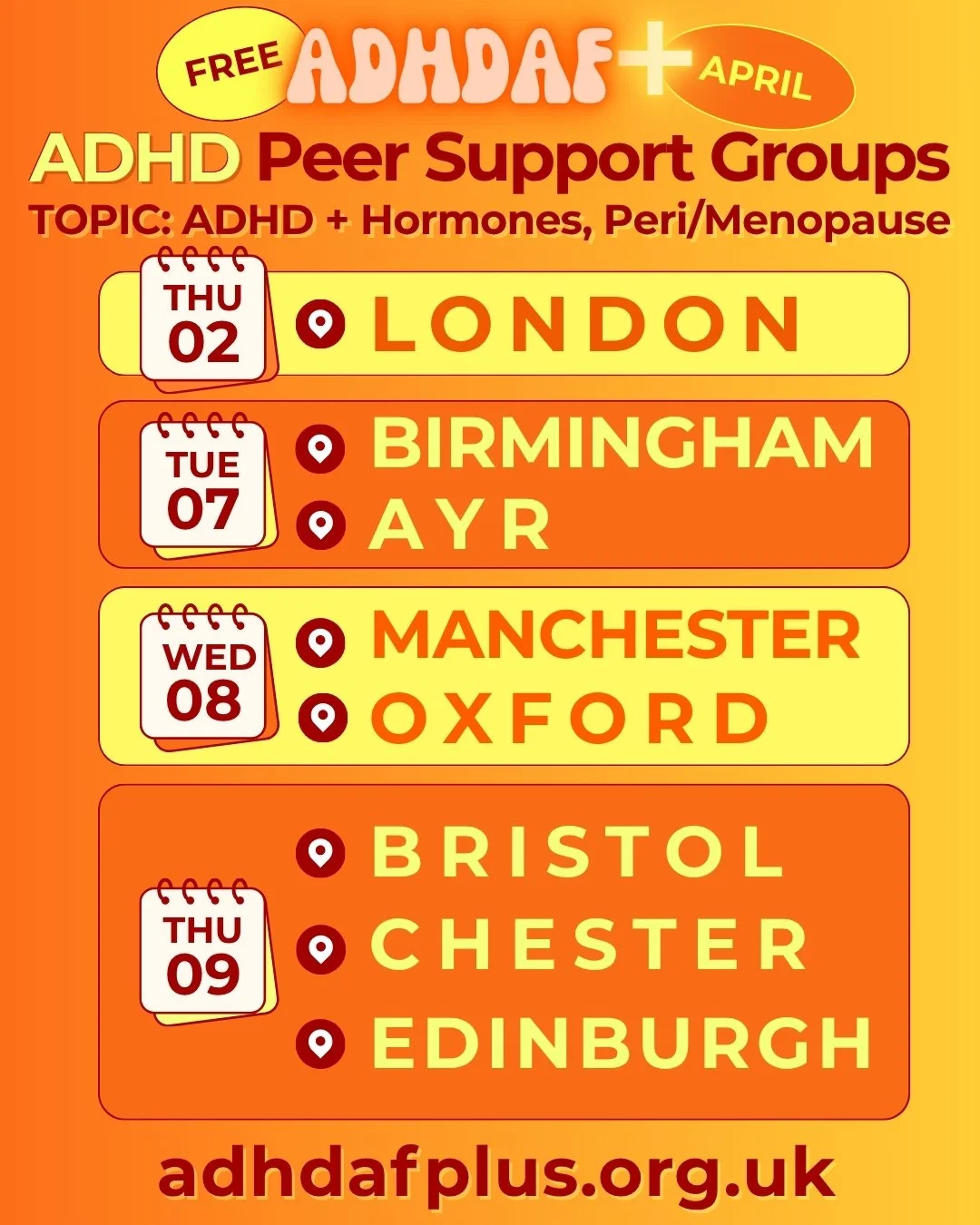 We hope you’ll be able to attend a free in-person ADHDAF+ ADHD Peer Support Group to discuss your experiences of ADHD and Hormones and to lean on and learn from literally like-minded locals for invaluable Peer Support in April.